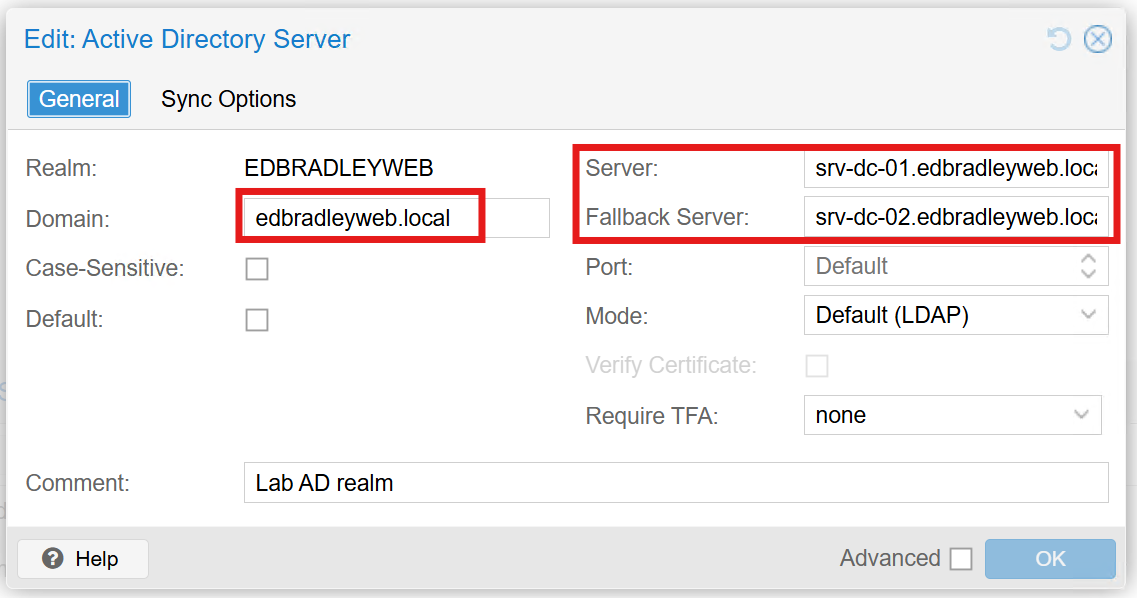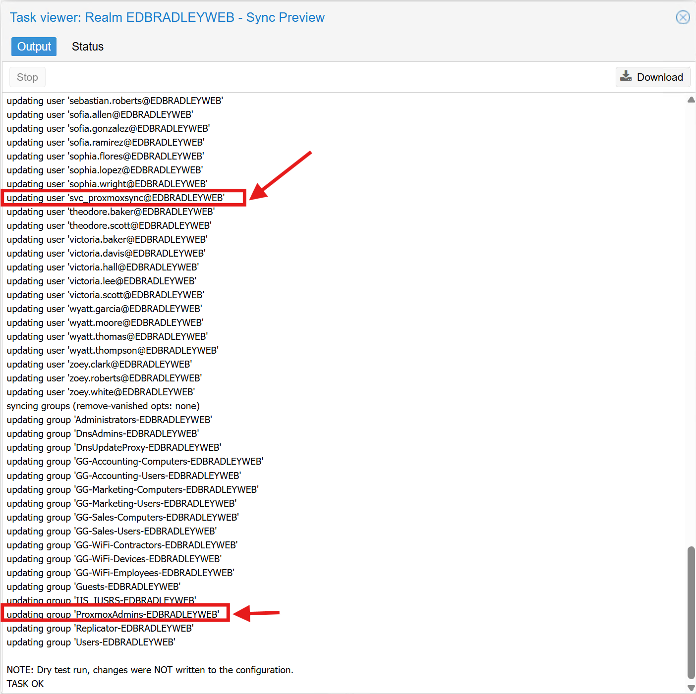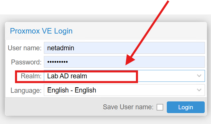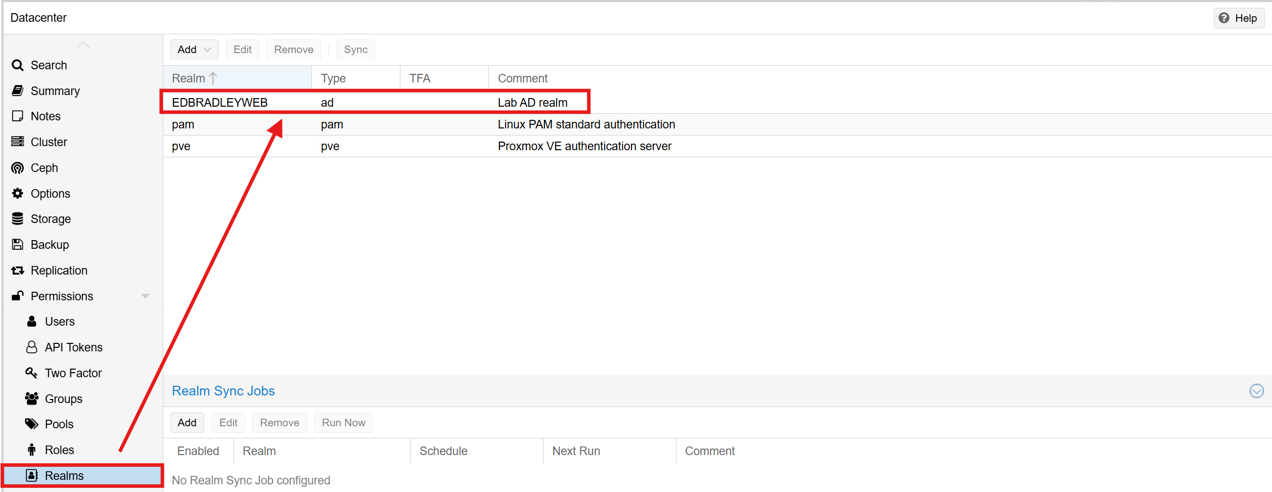 Proxmox makes it straightforward to integrate with Active Directory using Realms. After creating a realm for the domain, Proxmox can authenticate users through AD and even import groups for role-based access control.