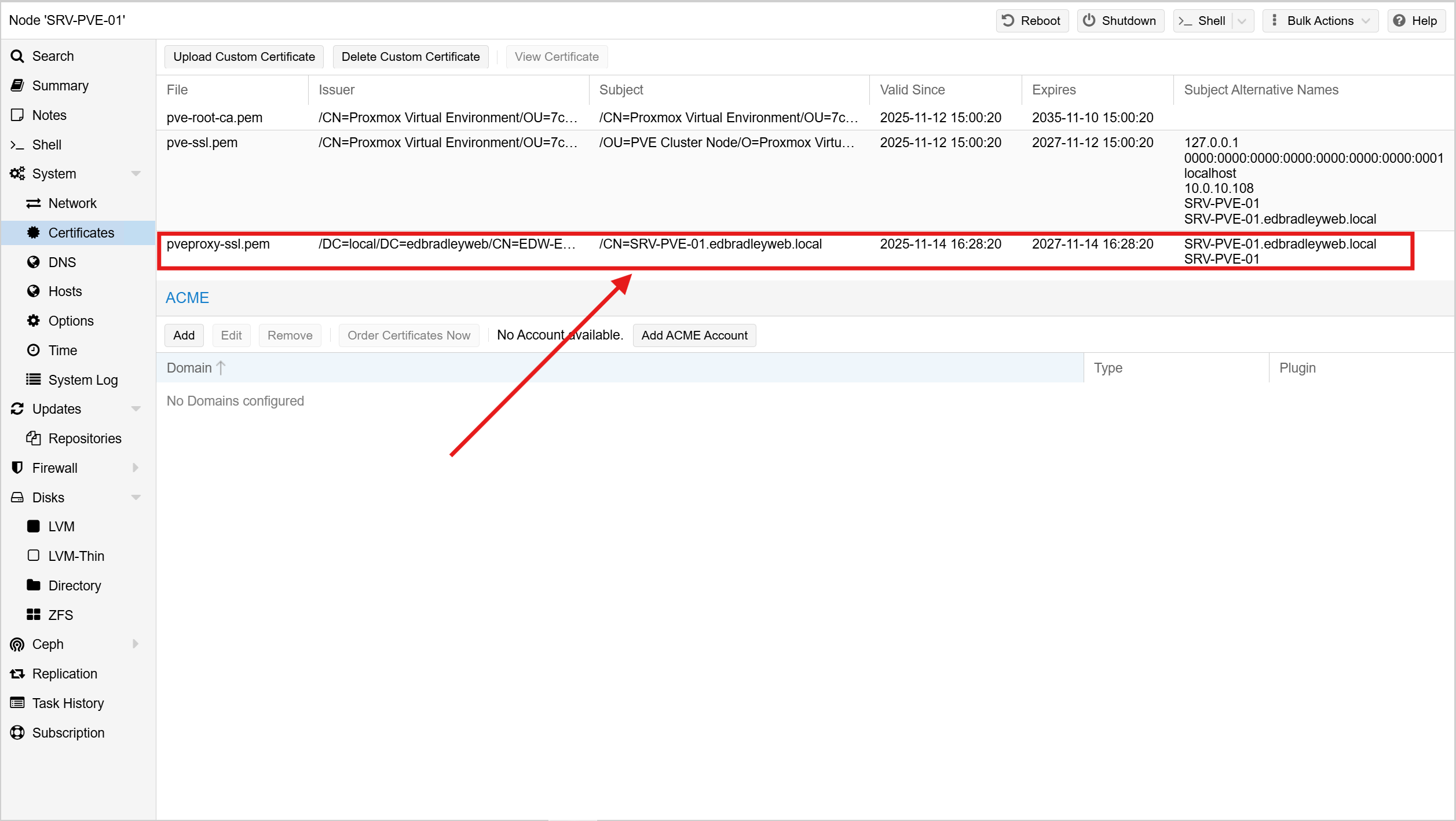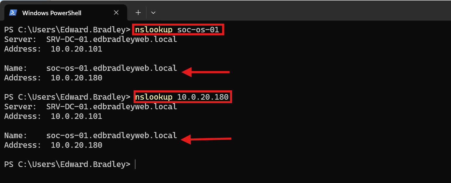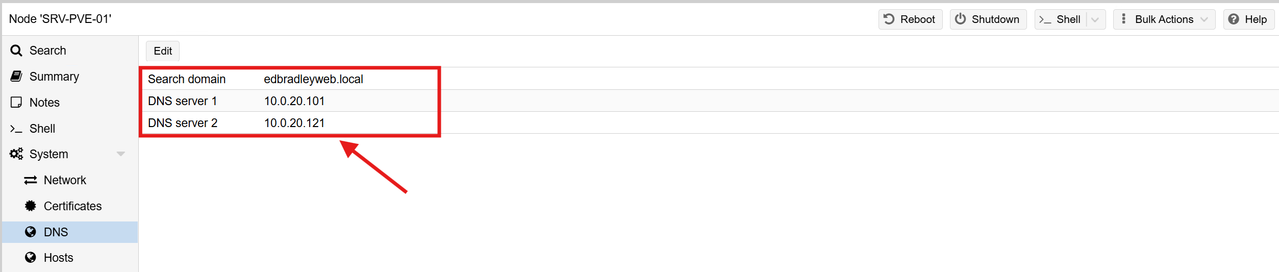 With Proxmox running, the next step was to integrate it into the lab’s Active Directory environment (edbradleyweb.local). At the network level, that starts with DNS.