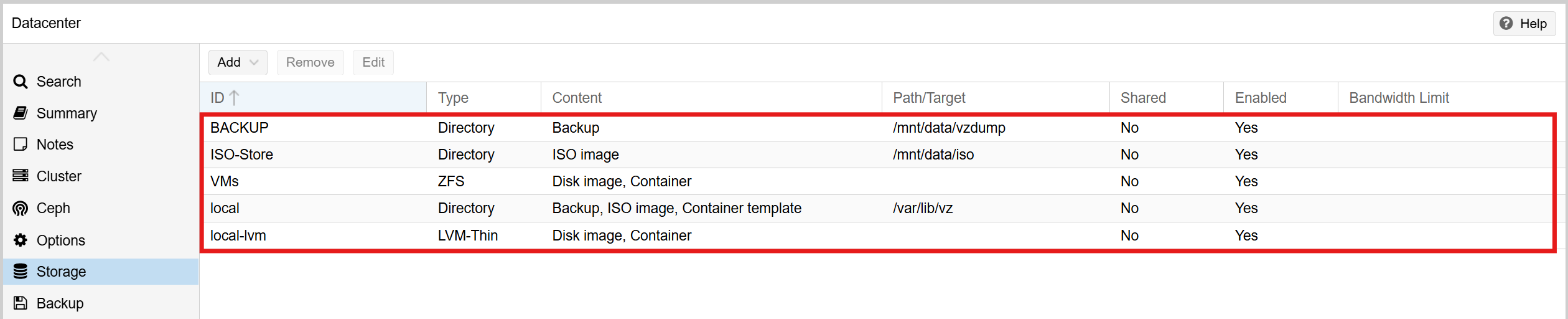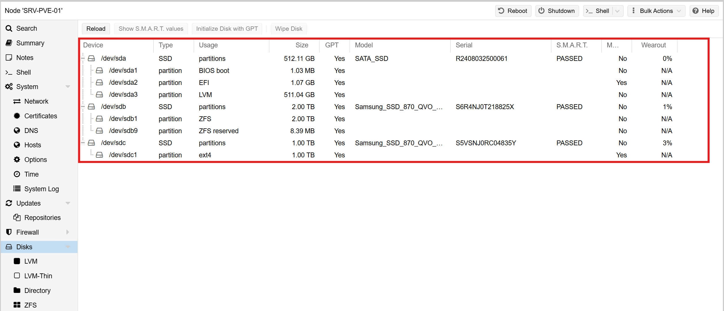 Before spinning up any virtual machines or containers, I structured the storage on the Proxmox host with purpose-built partitions: