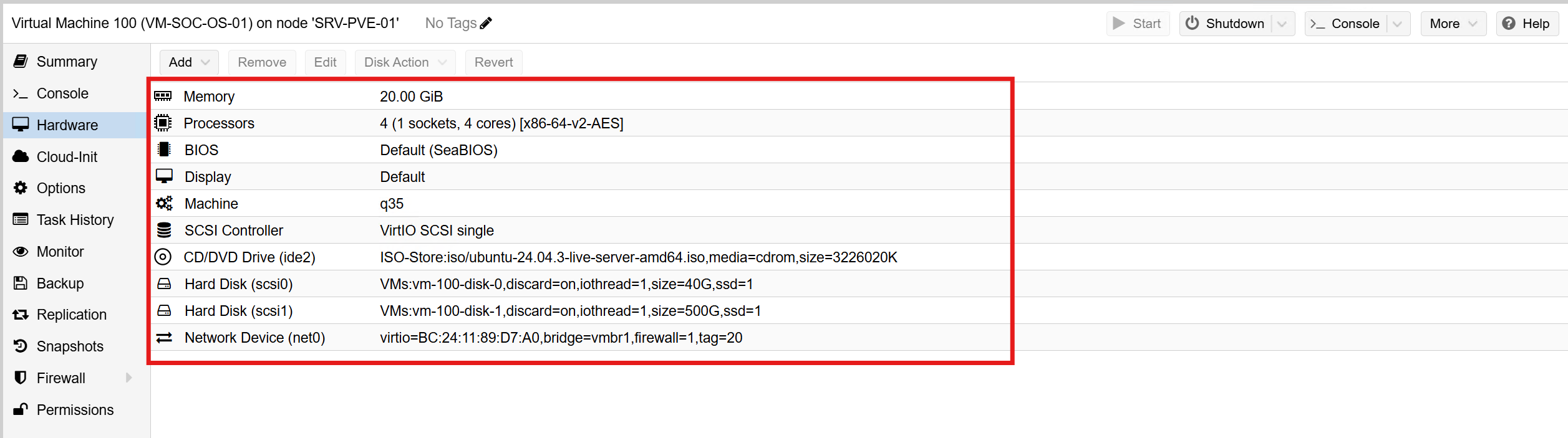 All components of the SOC are hosted on Proxmox VE 9.x (https://proxmox.com/en/products/proxmox-virtual-environment/overview), which provides the virtualization infrastructure, VLAN segmentation, storage management, backups, and resource allocation. This allows the SOC to operate as a complete, isolated solution on a single Dell workstation, without requiring separate hardware appliances.