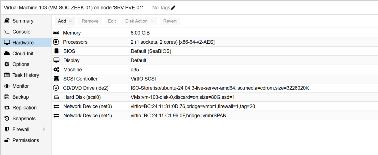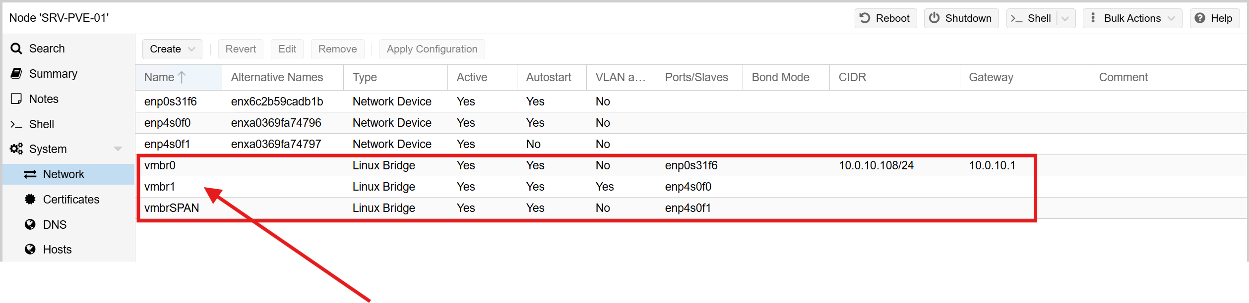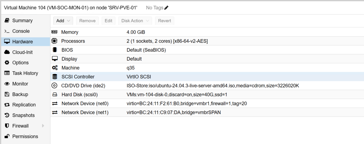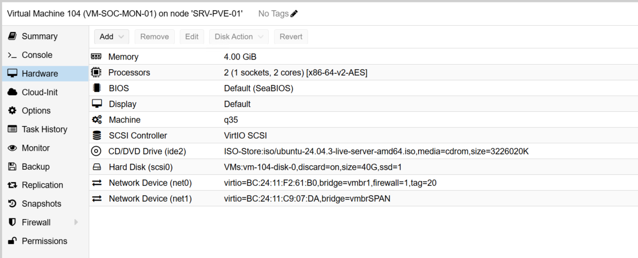 By assigning each NIC to a distinct Proxmox bridge—Management (vmbr0), VM Production (vmbr1), and SPAN Monitoring (vmbrSPAN), the host cleanly separates administrative access, VM data traffic, and network security inspection. This layout closely matches real-world SOC deployments and ensures the upcoming Mini SOC tools operate in a controlled, well-segmented environment.
