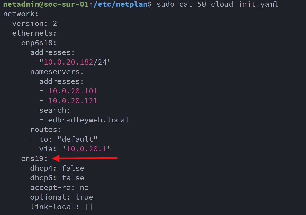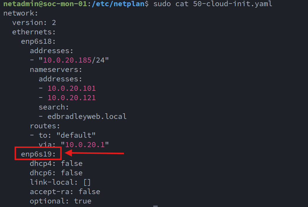 This interface is isolated strictly for administrative purposes, ensuring that VM workloads and security monitoring do not overlap with hypervisor management traffic. All Proxmox updates, backups, and AD integration occur over this dedicated mgmt VLAN.
