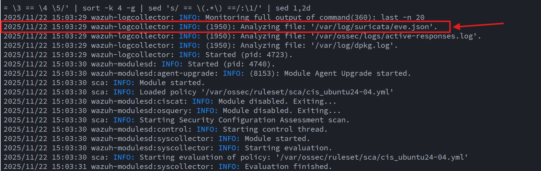 This configuration ensures that Zeek activity logs appear alongside Suricata alerts and host-based security telemetry within the Wazuh Dashboard, providing a unified and correlated view of network and endpoint behaviors across the lab environment.