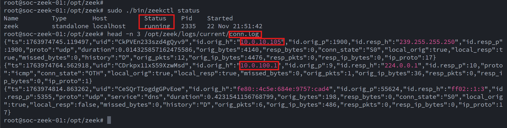 Once deployed, I verified that the service was running and generating log files under /opt/zeek/logs/current/.: