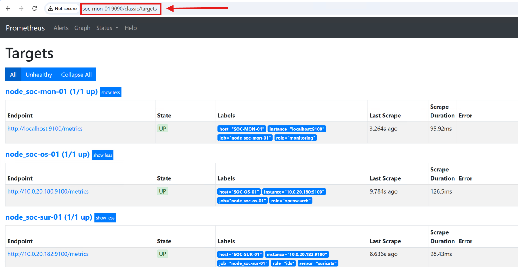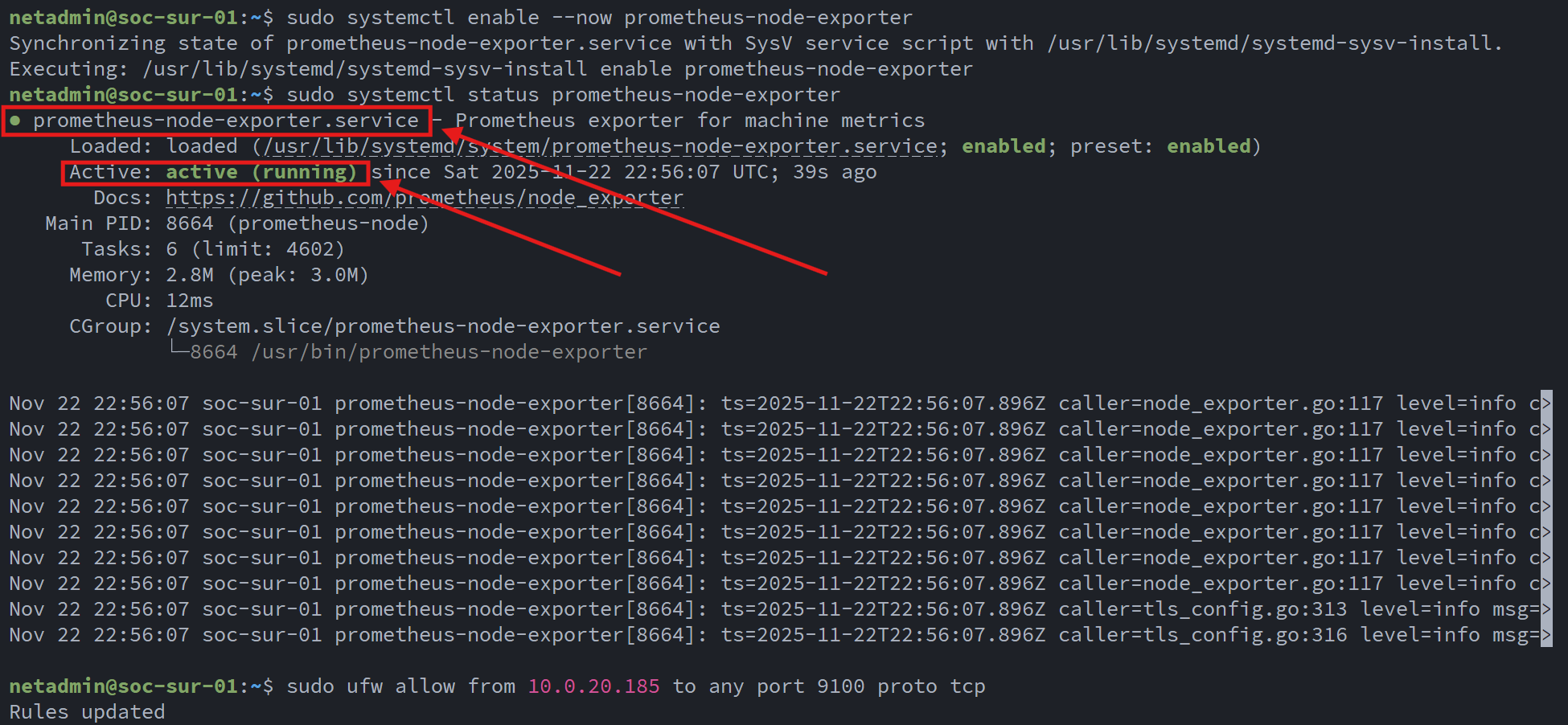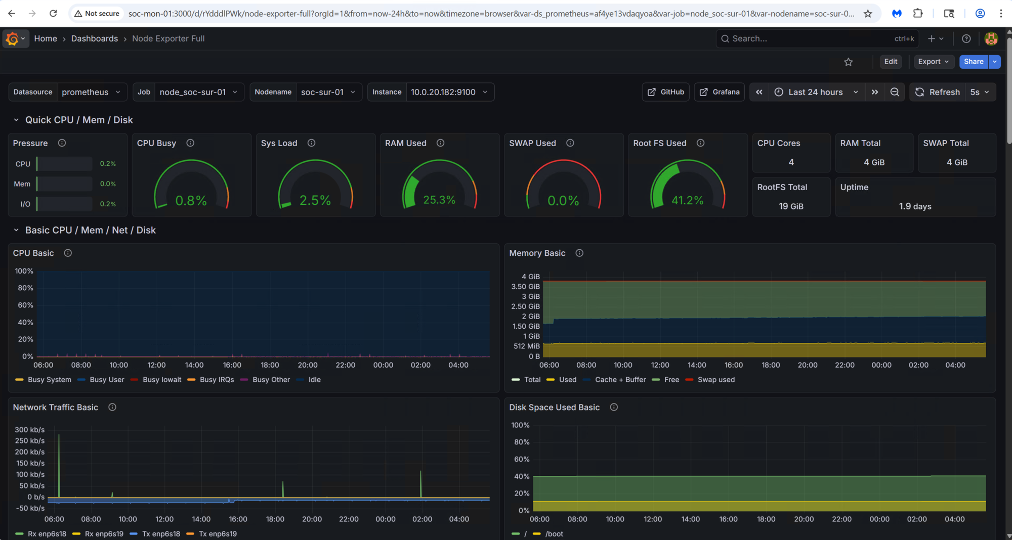 I began by installing the Node Exporter on every server participating in the SOC stack: