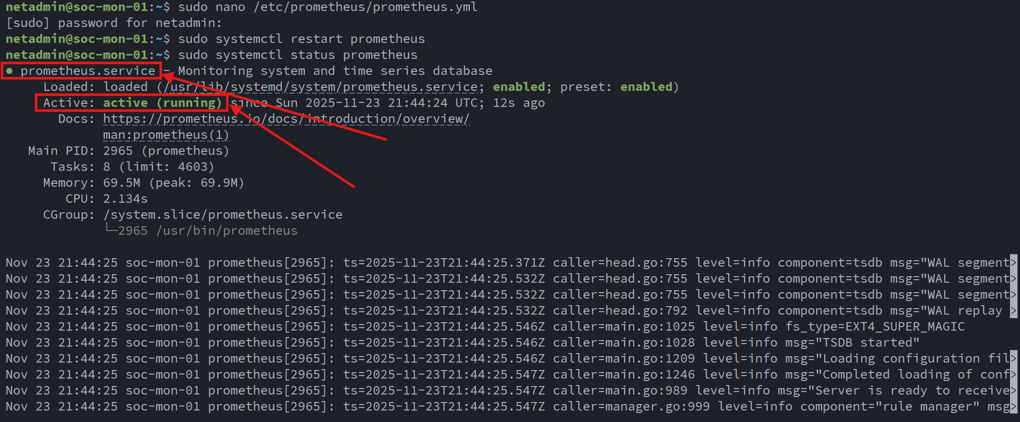 With the agents in place, I installed the Prometheus server on soc-mon-01 and configured it to scrape each system at regular intervals. Below is the relevant section of the Prometheus configuration: