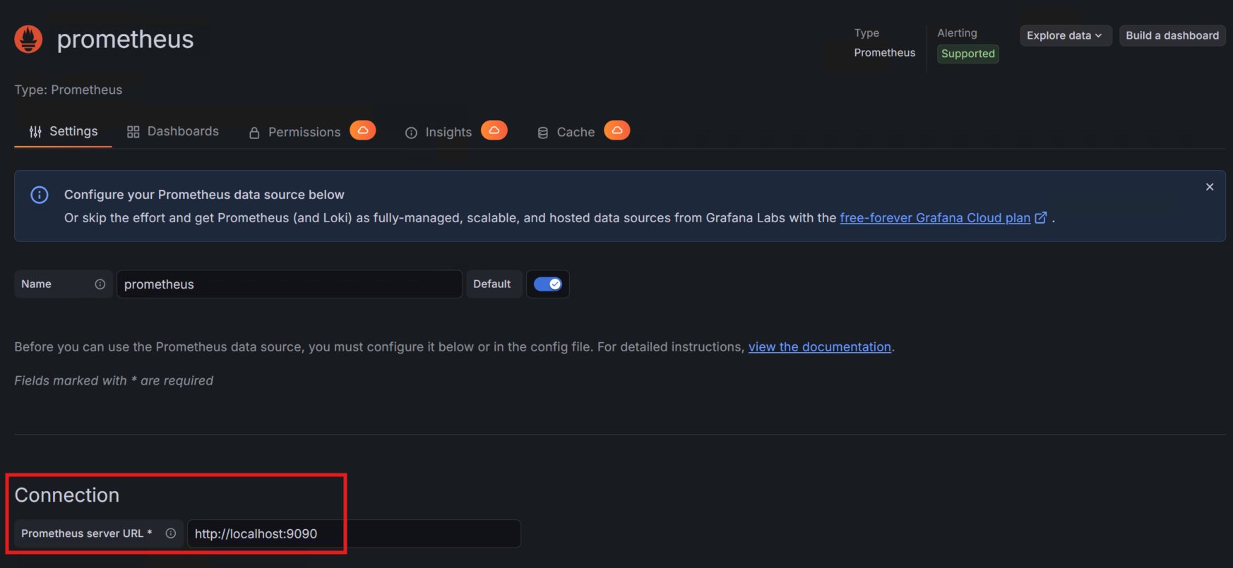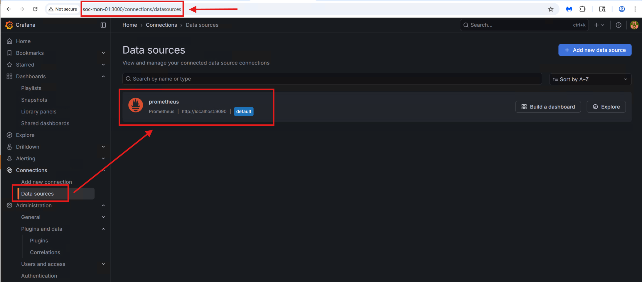 After the installation, I accessed the Grafana UI at http://soc-mon-01:3000 and added Prometheus as a data source.