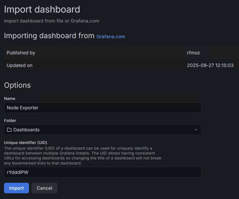 With the data source configured, I imported a pre-built dashboard—Grafana Dashboard ID 1860—which provides a comprehensive overview of system performance across all SOC servers.